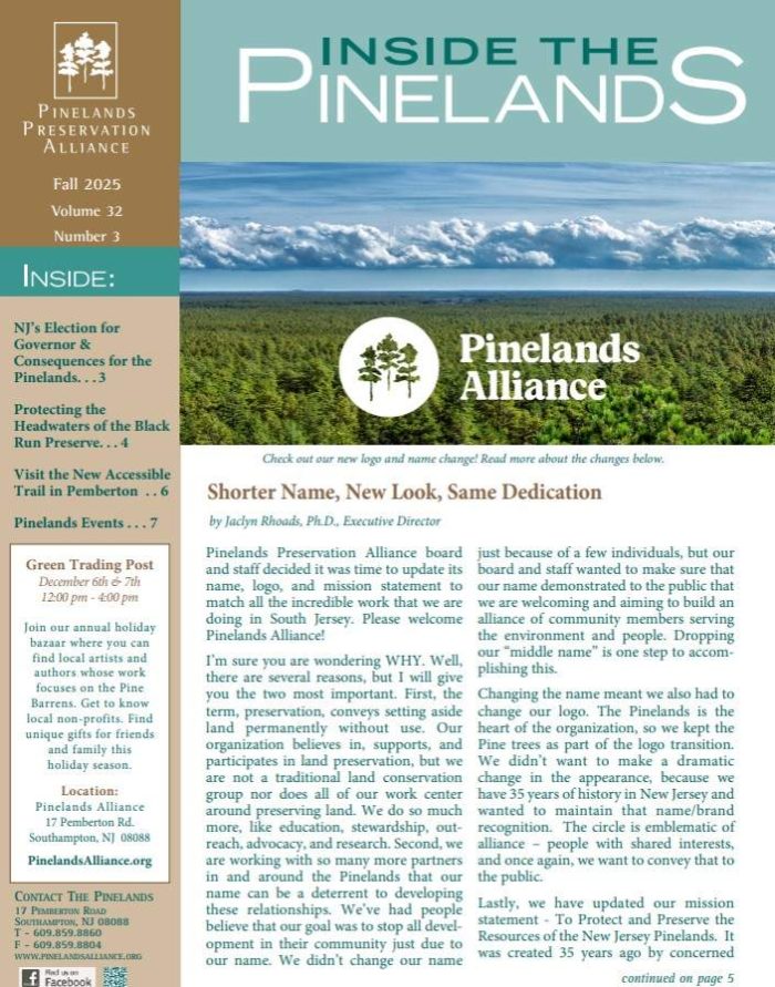 New Name Update, NJ Governor Election Effect on Pinelands, Protecting Black Run, New Accessible Trail, and more!